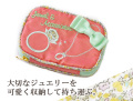 大人気のアクセサリーポーチ。落ち着いたカラーに、リングとネックレスのシルエットが刺繍され、右上にはリボンも付いて♪もう可愛さ満点!!ピンクとライトグリーンの配色も素敵です。大切なアクセサリー&ジュエリーをしっかり収納できる工夫がたくさん!リングホルダーやピアスホルダーに加え、ファスナー部分はちょっとした小物が収納できるようになっています。内側がお花柄なのもとってもかわいいポイント♪よく見るとリングのダイヤ部分にも内側と同じお花柄があしらわれています。軽くて汚れにも強いナイロン製。旅行先はもちろん!普段の付け替え用に持ち歩いたり、お家の収納用にも◎。贈り物にもおすすめです。