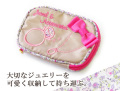 大人気のアクセサリーポーチ。落ち着いたカラーに、リングとネックレスのシルエットが刺繍され、右上にはリボンも付いて♪もう可愛さ満点!!ベージュとビビットピンクの配色も素敵です。大切なアクセサリー&ジュエリーをしっかり収納できる工夫がたくさん!リングホルダーやピアスホルダーに加え、ファスナー部分はちょっとした小物が収納できるようになっています。内側がお花柄なのもとってもかわいいポイント♪よく見るとリングのダイヤ部分にも内側と同じお花柄があしらわれています。軽くて汚れにも強いナイロン製。旅行先はもちろん!普段の付け替え用に持ち歩いたり、お家の収納用にも◎。贈り物にもおすすめです。