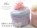 素敵な花柄レース生地と大きなフラワーモチーフがポイントのchouchouシュシュ シェリーのアクセサリーポーチ パープルです。コロンとした丸いフォルムが可愛らしく、持ち歩きにはもちろんお家のインテリアとして飾っても素敵です。内側は二段になっていて、細かなリングやピアス、ネックレスなどを分けて収納できるのも嬉しい!贈り物にも大変おすすめなアイテムです。