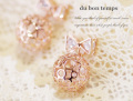 透かしボールに煌めくビジューが入ったピアス。リボンモチーフと揺れるボールが女性らしく耳元を演出してくれます。揺れるたびにボールに入ったビジューが動きながら煌めきます。全体的にピンクゴールドのワントーンで上品な印象。毎日着けたくなるピアスです。