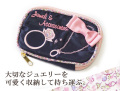 大人気のアクセサリーポーチ。落ち着いたカラーに、リングとネックレスのシルエットが刺繍され、右上にはリボンも付いて♪もう可愛さ満点!!ピンクとネイビーの配色も素敵です。大切なアクセサリー&ジュエリーをしっかり収納できる工夫がたくさん!リングホルダーやピアスホルダーに加え、ファスナー部分はちょっとした小物が収納できるようになっています。内側がお花柄なのもとってもかわいいポイント♪よく見るとリングのダイヤ部分にも内側と同じお花柄があしらわれています。軽くて汚れにも強いナイロン製。旅行先はもちろん!普段の付け替え用に持ち歩いたり、お家の収納用にも◎。贈り物にもおすすめです。