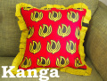 アフリカ雑貨の中でも人気の高いカンガ布で作られたクッションカバー イエロー系です。カンガ布とは東アフリカの生活に欠かせないプリント布のこと。中央にことわざやメッセージがスワヒリ語で書いてあります。ケニア製のカンガ布は独特な色味と発色の良さ、そして日本には無いデザインが特徴です。このカンガ布で贅沢にフリルまで付けてとても存在感のある素敵なクッションカバーに仕上げられています。