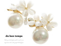 ムーストーンの独特な光沢が美しいフラワーモチーフピアス。とても高級感があり、エレガントなので結婚式用のピアスとしてもおすすめ。華やかな場面で活躍してくれます。お花が二つ寄り添ったようなデザインにパールが施されています。片方のお花にはラインストーンが施されちょっと違ったポイントに。控えめなカラートーンなのでどんな色のお洋服にも合わせやすいのもうれしいポイントです。プレゼントにもおすすめ。
