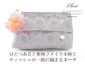 素敵な花柄レース生地と大きなフラワーモチーフがポイントのシュシュ シェリーのティッシュケース付きポーチ パープルです。ポケットティッシュが入るティッシュケースだけでなく小物が収納できるポーチが付いているのでとっても便利!内側には仕切りもあって機能的。ひとつあるととても重宝するアイテムです。化粧品などの汚れに強いポリエステル製。贈り物にも最適なアイテムです。