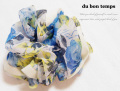 ふんわりシフォンがフェミニンなシュシュ。黄色と青がミックスされたお花柄がキレイなデザイン。お花柄だけど可愛くなりすぎず、大人っぽい印象でデイリーに使えるシュシュです。
