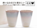 【NHKの「イッピン」で紹介されました!】日本の伝統的な陶器 萩焼。山口県萩市の窯元椿秀窯 萩陶苑から青と白のグラデーションが美しいミントシリーズが届きました。こちらは新作カップ(タンブラー)のペアセットです。湯呑みとしてお茶を楽しんだり、焼酎や日本酒を楽しむのにも最適です。フチはほんのりピンク色で美しい青を引き立てます。青といってもターコイズに近い絶妙な色合い。内側までグラデーションが美しく、中心に近づくほど深い青になります。テーブルの上がパッと華やぎますので、普段のお茶や、晩酌がさらに楽しい時間になりそうです。古くから日本人に愛され続けている萩焼きの特徴は焼き上がりの柔らかさとその吸水性です。高火度で比較的短時間で焼成し土味を残すため、感触が柔らかく、土があまり焼き締まっていないので保温性を持っています。さらに吸水性があるため、使い込むことによって『茶馴れ』や『萩の七化け』と呼ばれる色合いの変化を楽しむことができるため、長年使い込むほどに愛着がわく陶器です。茶道の世界では、古くから茶人による茶碗の格付けとして、『一楽・二萩・三唐津』【楽焼(京都)、萩焼(山口県萩市)、唐津焼(佐賀県唐津市)】と言われるほど、茶人にも認めらた陶器のひとつです。萩陶苑のブランドロゴが入った木箱入りなので結婚祝いやお引越し祝い、母の日や父の日のギフトにもおすすめです。