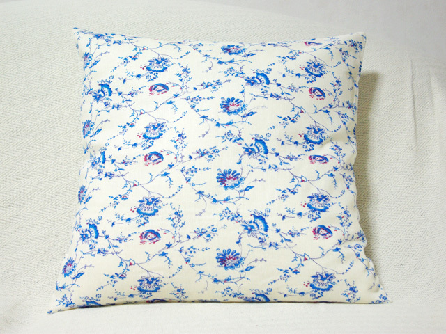 ブルーの野花模様にポイントの赤が生えて爽やかな印象のおしゃれなクッションカバーです。春や夏の涼しげな部屋を演出するのにぴったりです。生地には麻を使用しているためしっかりとして安心感のある肌ざわりです。一般的な45×45cmのタイプです。
