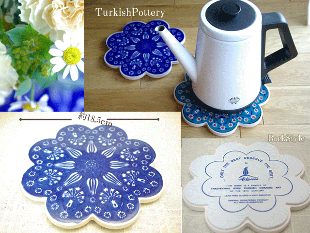 トルコタイルの美しい鍋敷きです。ブルーがベースのトルコタイルに定番の伝統的なチューリップやカーネーションが繊細に描かれたデザインです。裏にはクッション材がついていて安定感も抜群です。鍋敷きはもちろん、ティータイムにはティーポットを置いて。またお部屋に飾ってインテリアとしても楽しめます。贈り物のギフトとしても喜ばれます。