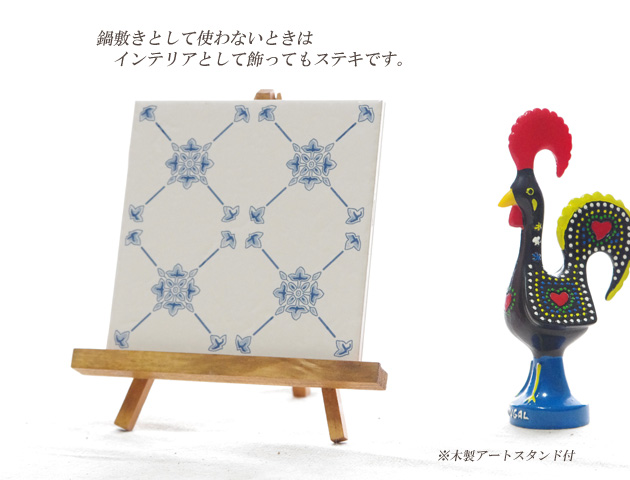 ポルトガルではタイルのことを「アズレージョ」と呼び古くから人々の生活にとても身近なものとして親しまれています。そんなポルトガルの絵タイルでできた鍋敷きです。こちらの鍋敷きは等間隔にお花模様が描かれ可憐な印象。シンプルな色合いで飽きのこないデザインです。裏面にはコルク材がついてテーブルなどを傷つけにくくなっています。また、アートスタンドもセットになっているので、使わないときはアートの様にスタンドにセットして飾ることもできます。玄関などに飾っても素敵。タイルの表面は汚れても拭くだけでさらっと汚れが落ちやすいのでお手入れも簡単です。贈り物にも最適です。