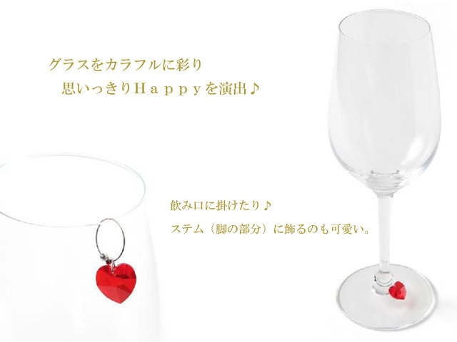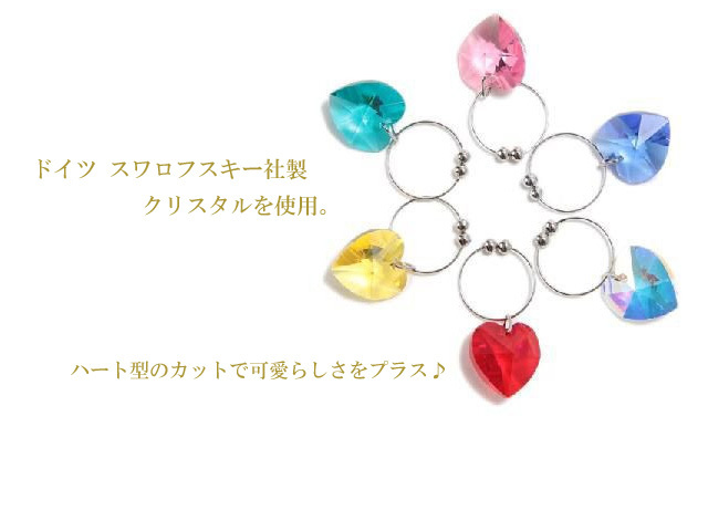 グラスにキラッとアクセント♪スワロフスキークリスタルを使用したハート型が可愛いグラスマーカーです。ヨーロッパでは昔から愛用されているグラスマーカー。ホームパーティーで自分のグラスがわからなくならないようにというのが本来の使用目的ですが、最近ではグラスを可愛くするアイテムとして人気を集めています♪ホームパーティ時のプレゼントや、新築祝い、などにも喜ばれるアイテムです♪