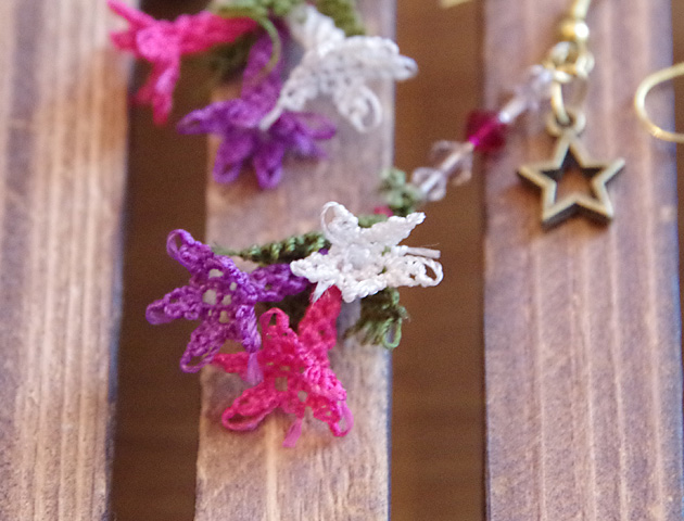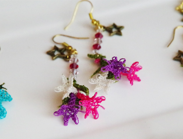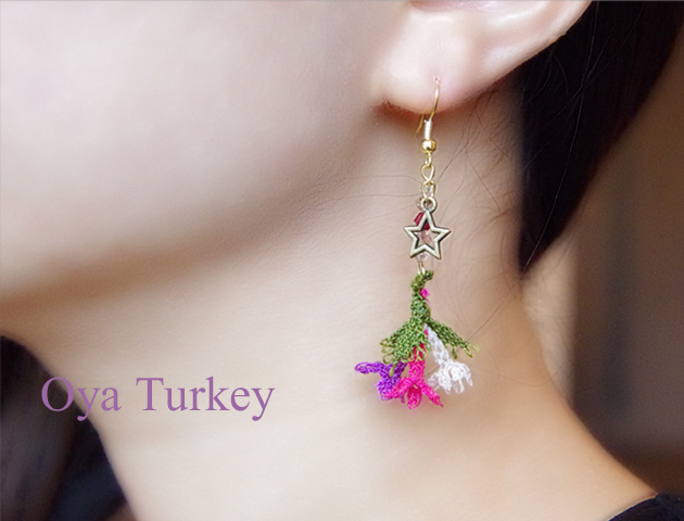 【トルコ雑貨】> トルコ伝統のレース編み”イーネオヤ”のピアス。立体的に編まれた3色のカラフルなお花がゆらゆら揺れてとってもフェミニン♪日本ではあまりお見かけしないデザインと色使いが魅力的です。スターモチーフのチャームとストーンビーズがアクセントになってかわいい♪ビビッドカラーでお顔周りをすっきり華やかに演出してくれます。イヤリングへの加工も承ります。