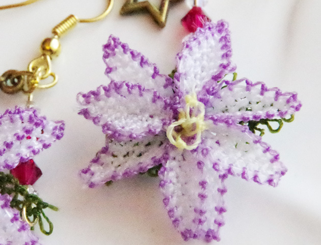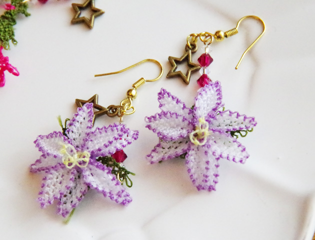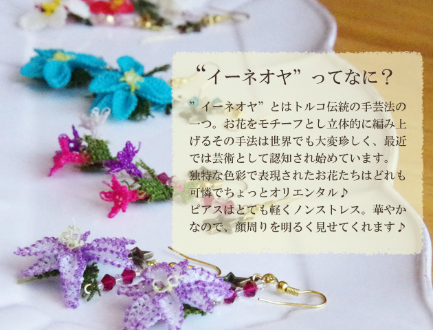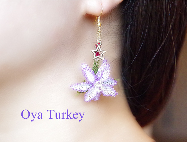 【トルコ雑貨】トルコ伝統のレース編み”イーネオヤ”のピアス。立体的に編まれた薄紫のお花がゆらゆら揺れてとってもフェミニン♪トルコらしいオリエンタルな色彩が魅力的です。スターモチーフのチャームとストーンビーズもアクセントになってかわいい♪柔らかく揺れるお花モチーフが顔周りを華やかに演出してくれます。イヤリングへの加工も承ります。