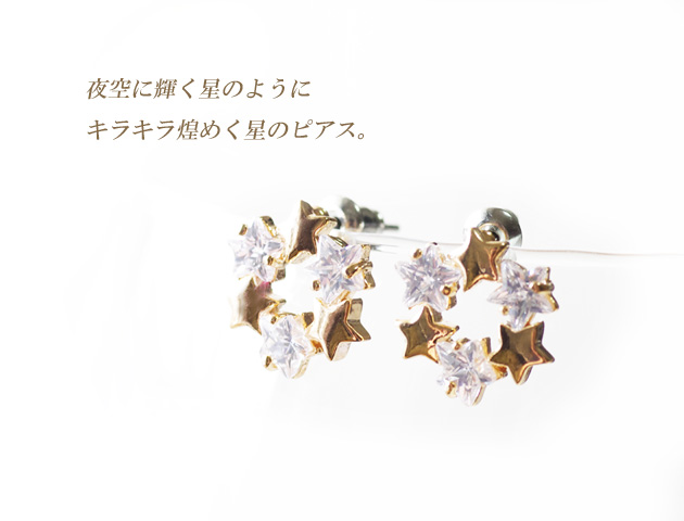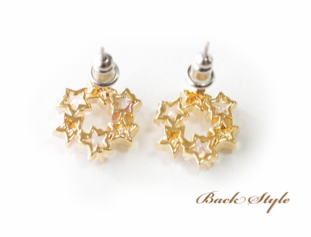 煌めく星がリース状に連なってキラキラと輝くピアスです。星型のゴールドとビジューが交互にかさなり、とってもキュート。存在感たっぷりでアップにするととてもよく映えます。またシンプルなカラーリングで様々なスタイルに合わせやすいのも嬉しいポイントです。