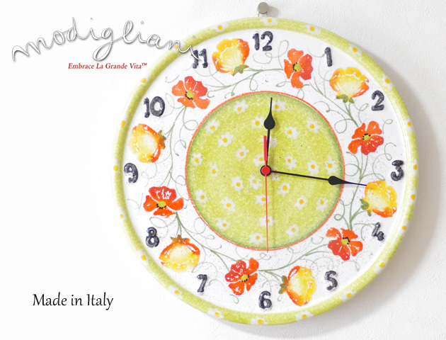 イタリア陶器ブランドの老舗【Modigliani モディリアーニ】から素敵な陶器製時計が届きました!花々が元気に描かれた「FIESOL」シリーズ。イタリアの陽気な雰囲気が感じられるあたたかみのある色合い。イエローとオレンジのグラデーションが美しく、白い小花が可愛らしい♪温かみのある陶器製の時計はインテリアの雰囲気をガラッと明るい雰囲気に。飾り時計として飾っても素敵です♪新築祝いや結婚祝いなどの贈り物にも最適です。