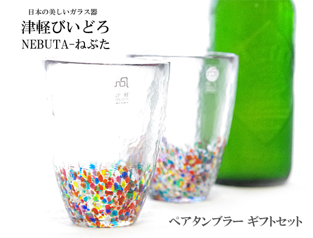 【再入荷!】東北三大夏祭りのひとつである青森「ねぶた祭り」の鮮やかさと高揚感を8色の色ガラスを使用し表現した、透明感のある美しいガラス食器シリーズ「ねぶた-NEBUTA」のペアタンブラーギフト(カゴ入り)です。一つ一つ熟練された職人の手作りであり、どれ一つとしてまったく同じものが存在しません。まさに世界に一つだけ。ガラスの色づくりには長年の経験と技術が必要です。その優れた技術は青森の優れた技術者の称号「あおもりマイスター」として認定されています。涼しげなグラスの中で響き合う多彩な色にうっとりしながらお酒をたしなむ。そんな時間はなんだかとっても素敵です。かわいいカゴに入ってラッピングされているので結婚祝いや新築祝いなどの贈り物にも最適です。