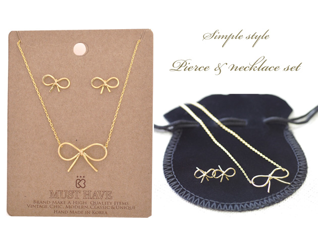 これひとつで簡単!完璧コーデ。シンプルなスリムリボンモチーフのピアス&ネックレスのセットアップです。華奢なチェーンが女性らしく、トップのゴールドモチーフはマットな質感で派手すぎずおしゃれに煌めきます。おそろいのピアスはひとまわり小さいリボンモチーフ。立体的なリボンモチーフは可愛らしいだけなく大人っぽい印象。セットだけでなく単体でも使えるので幅広いスタイルに合わせて楽しめます♪