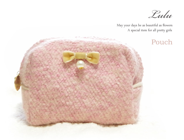 人気シリーズLuluルルのポーチ ピンクです。グラデーションがおしゃれなツイード生地を採用。リボン&パールがポイントになり可愛さをプラス。起毛のツイード生地なのですもこもこ感があります。内側は光沢のあるサテン生地。内ポケットがひとつ付いていて便利です。たっぷり入る大容量!四角いフォルムでバッグの中に納まりやすいのもグッドポイントです。ちょっとした贈り物にも最適です。