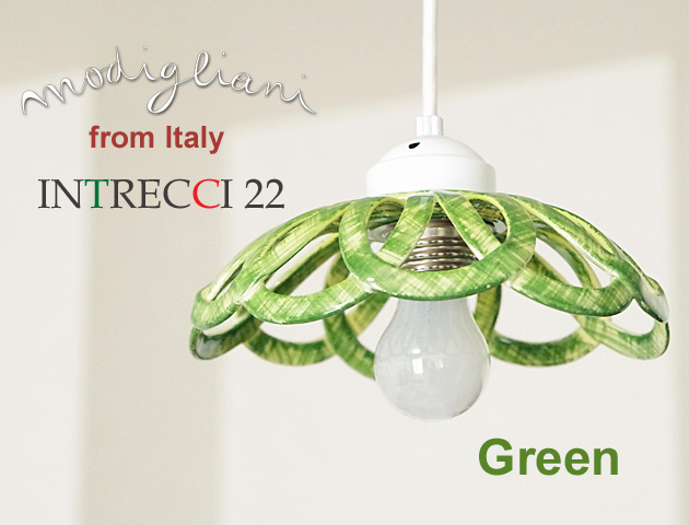 圧倒的な存在感を放つペンダントライト。丸みを帯びたフォルムが優しい印象の「INTLAMPC/22」グリーンです。イタリアModiglianiモディリアーニの技術で仕上げたアーチを重ねたような形状のシェードから光がこぼれます。陶器の温かい雰囲気が心地よい空間を演出してくれます。優しい雰囲気のグリーンは合わせずらそうに感じますが、観葉植物を飾ってあるお部屋でしたら、意外としっくり落ち着いた雰囲気にまとまります。24に比べて少し小さ目のシェードですのでダイニングテーブルの上のペンダントライトにおすすめです。コードやソケット部分は日本仕様のものに付け替えてありますので、安心してお使い頂けます。取り付けは簡単な引掛けシーリング式です。