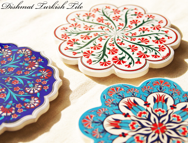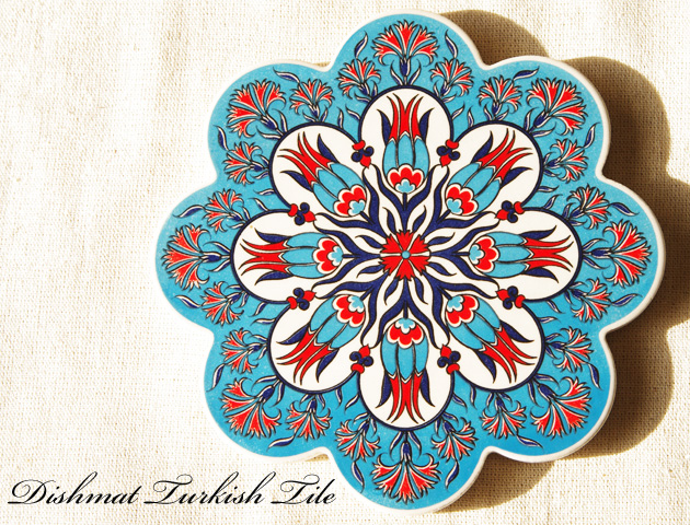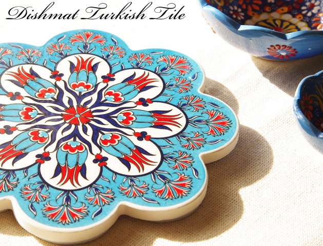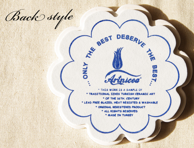 Artnicea社製トルコタイル花型鍋敷きです。花の形にかたどられたタイルにトルコ独特のターコイズブルーと赤の色彩が美しい絵柄が描かれています。。トルコではチューリップは神聖な花として、カーネーションは天国を意味する花として特別な意味があります。そのためトルコタイルにも多く描かれ、トルコの人々に愛されています。タイルの裏にはArtnicea社のネーム入りのクッション材がついています。安定感が抜群な上にテーブルなどを傷つける心配はありません。鍋敷きはもちろん、ティータイムにはティーポットを置いて。またお部屋に飾ってインテリアとしても楽しめます。贈り物のギフトとしても喜ばれます。