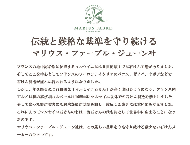 パーム油とヤシ油をバランス良く配合した無添加石けん。地中海の海水で塩析した石けん素地を自然な潮風にさらして熟成させました。フランス マリウス・ファーブル・ジューン社では1900年の創業時より変わらぬ伝統製法でマルセイユ石けんを作り続けています。オリーブタイプとはまた違った使い心地をお楽しみください。泡立ちも良くモチモチと弾力のある泡が全身を包みます。皮脂を取り過ぎないので優しい洗い心地。お肌をしっとりと洗い上げます。オリーブタイプに比べ独特の匂いが少ないので香りに敏感な方におすすめです。またシャンプーとしても好評です。また可愛らしいパッケージも人気でプチギフトとしても喜ばれます。