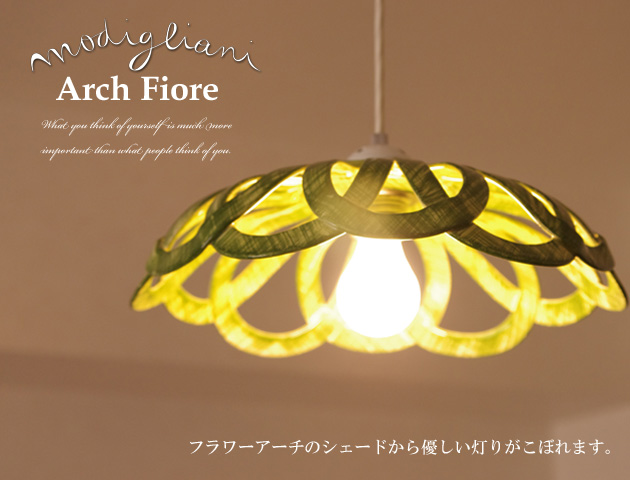 圧倒的な存在感を放つペンダントライト。丸みを帯びたフォルムが優しい印象の「INTRECCI "Arch Fiore"」グリーンです。イタリアModiglianiモディリアーニの技術で仕上げたアーチを重ねたような形状のシェードから光がこぼれます。陶器の温かい雰囲気が心地よい空間を演出してくれます。優しい雰囲気のグリーンは合わせずらそうに感じますが、観葉植物を飾ってあるお部屋でしたら、意外としっくり落ち着いた雰囲気にまとまります。コードやソケット部分は日本仕様のものに付け替えてありますので、安心してお使い頂けます。取り付けは簡単な引掛けシーリング式です。