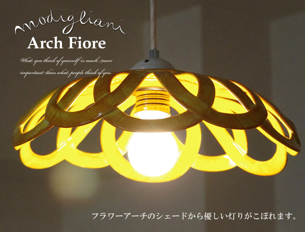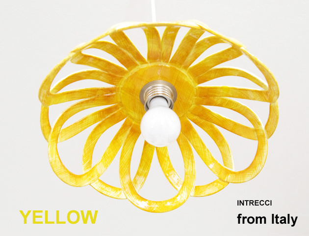 圧倒的な存在感を放つペンダントライト。丸みを帯びたフォルムが優しい印象の「INTRECCI "Arch Fiore"」イエロー(黄色)です。イタリアModiglianiモディリアーニの技術で仕上げたアーチを重ねたような形状のシェードから光がこぼれます。陶器の温かい雰囲気が心地よい空間を演出してくれます。原色のイエローではなくマスタード色っぽい落ち着いたイエロー。イタリアの陽気な雰囲気を感じるイエローはお部屋をぱっと明るくしてくれます。コードやソケット部分は日本仕様のものに付け替えてありますので、安心してお使い頂けます。取り付けは簡単な引掛けシーリング式です。