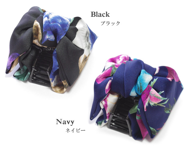 サテンの光沢が美しく、素敵な花柄が目を惹くヘアクリップ(バンスクリップ)です。パカッと開いて挟むだけのヘアクリップはその簡単さが人気!忙しい朝の強い味方です。後ろから見たときにキレイなリボンになるので後ろ姿に自信が持てます♪カラーバリエーションも美しく大人っぽいので、毎日のおしゃれのワンポイントにいかがでしょうか?お食事や仕事中などささっと髪をまとめたい時にもとっても便利なので、バッグの中に1つあると嬉しいアイテムです。大人っぽい4カラーよりお選びいただけます。