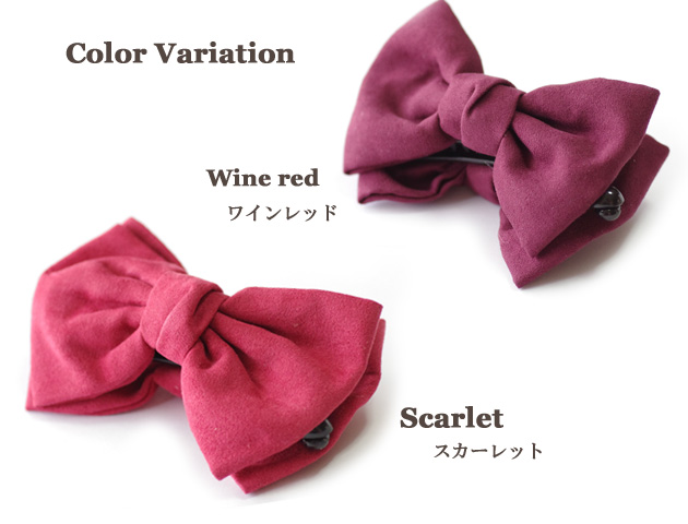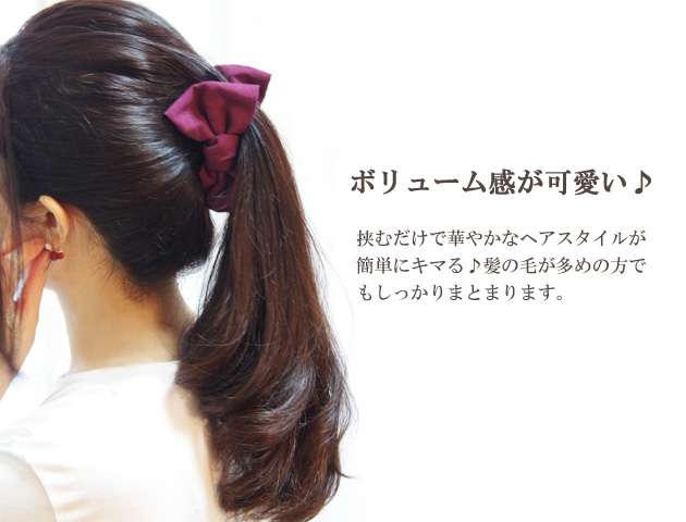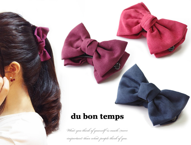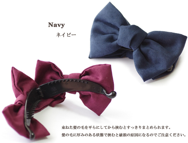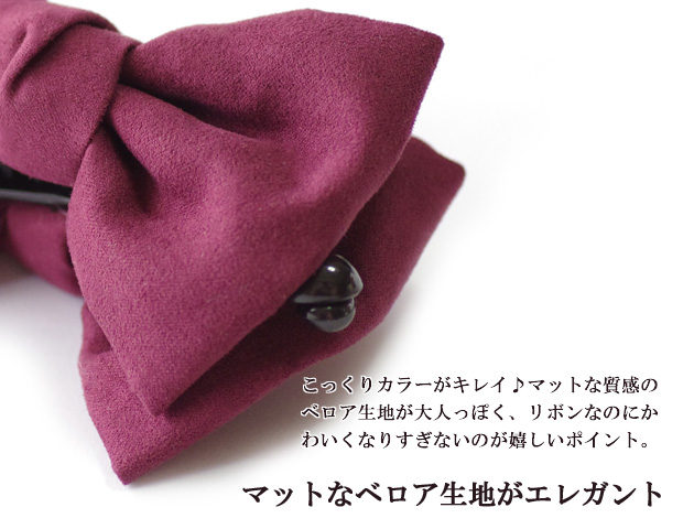 ベロア素材で品のあるリボン型バナナクリップ。大きめリボンで存在感抜群!髪が多めの方でもしっかり一つにまとめられるのが嬉しい!落ち着いたカラーなのでリボンなのに子供っぽくならないので、オフィススタイルやパーティースタイルにもおすすめです。朝の忙しい時間でも一つにまとめるだけで簡単にアップスタイルがつくれちゃう♪大活躍マチガイ無しのバナナクリップです。