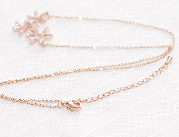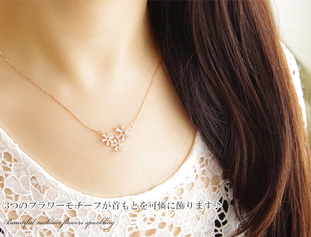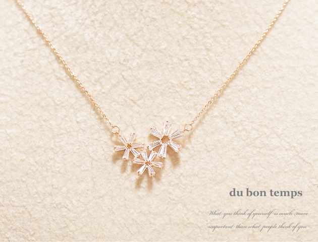 細く短めのチェーンに大中小と大きさの違う3つのクリスタルフラワーモチーフがついたネックレス。大人っぽいシンプルなフラワーモチーフが上品に煌めき、首もとを飾ってくれます。どんなスタイルにも合わせやすいネックレスなので毎日着けたくなっちゃう♪ピンクゴールドで女性らしさUP!保管や持ち運びに便利なベロア巾着付なのも嬉しいポイントです。