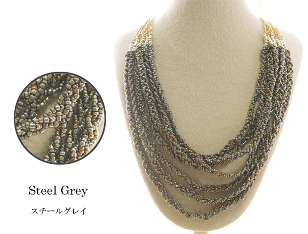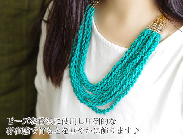 1本でも贅沢なビーズネックレスを7本も連ねた圧倒的な存在感のビーズネックレス。7本それぞれ長さが違うので重ねると幅広の1本のようにもみえます。ランダムに重ねると無造作感が出てそれはそれでまた素敵です♪上部には丸いビーズを使用しアクセントをつけています。取り外しはナスカン式で長さ調節可能です。大人っぽく上品なカラーバリエーション3タイプからお選びいただけます。