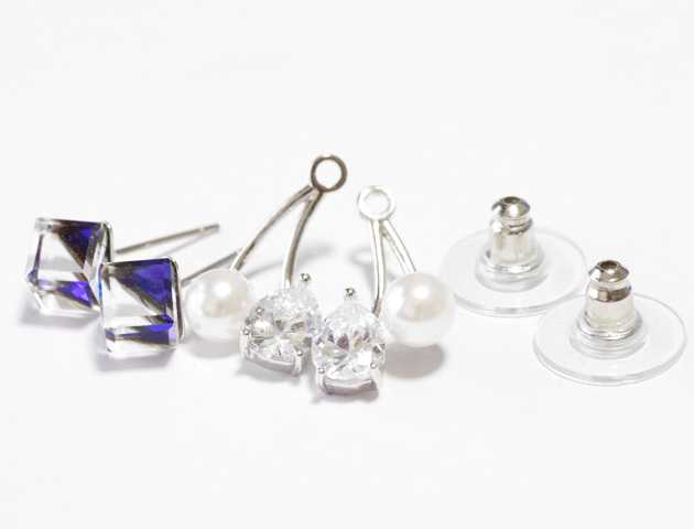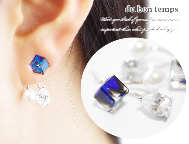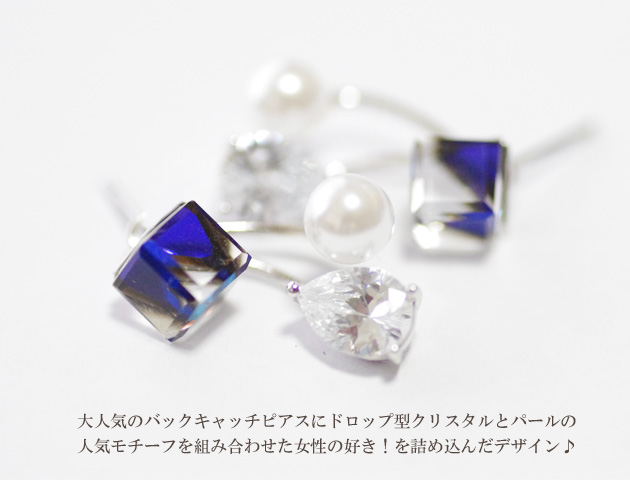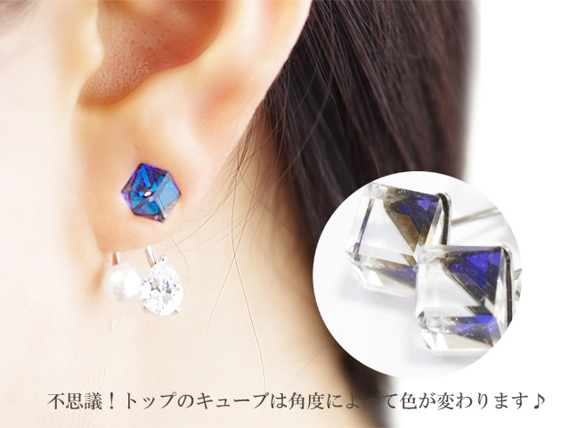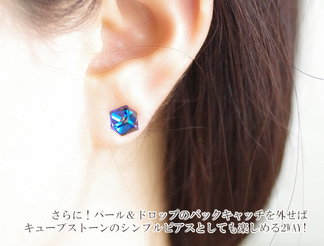 人気の角度によって色が変わるキューブピアス。見る角度によって透明だったりブルーだったりととっても不思議なキューブストーン。今回はこれまた人気のバックキャッチスタイル。耳の後ろからパールとドロップ型のクリスタルがのぞいてとっても素敵。さらにそのキャッチを外せばシンプルなキューブピアスとしても使える2WAYなのが嬉しい♪その日の気分に合わせて2パターンで楽しめます。大人っぽいシルバーなのでどんなスタイルにも合わせやすく、様々な場面で活躍してくれそうです。