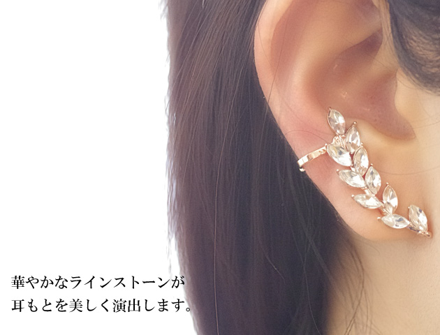 ボタニカルモチーフが素敵なイヤーカフに♪クリスタルが耳を沿うように煌めきます。とてもエレガントでパーティーやお呼ばれスタイルにぴったり。さらに同モチーフのピアスもついているので、両耳でアシンメトリーに楽しめます。シンプルな色使いなので普段のスタイルにプラスしてもステキです。ピアス&クリップなのでしっかり固定されます。