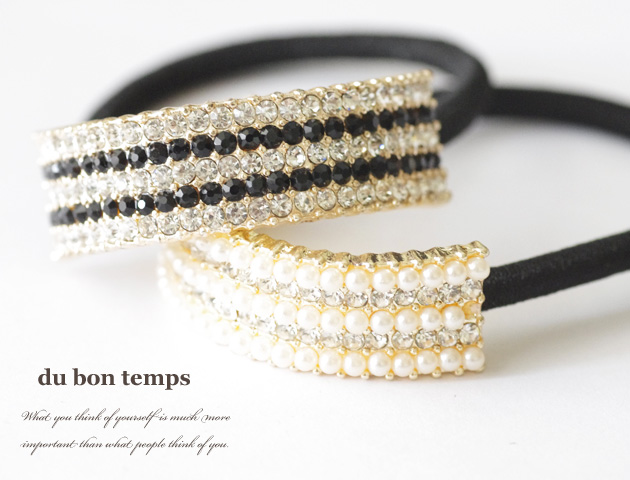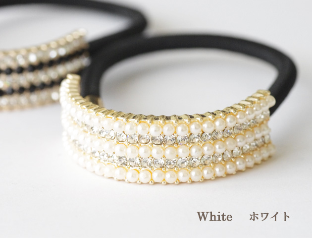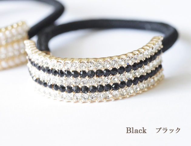 ラインストーンをハーフラウンド型に敷きつめたヘアゴム。髪を結んだゴムが隠れて素敵に演出してくれます。カラーはホワイトとブラックの2色からお選びいただけます。ホワイトにはパールをブラックにはツートーンのラインストーンが施されています。いつものスタイルにプラスするだけでおしゃれな雰囲気に。ひとつあると重宝するヘアゴムです。