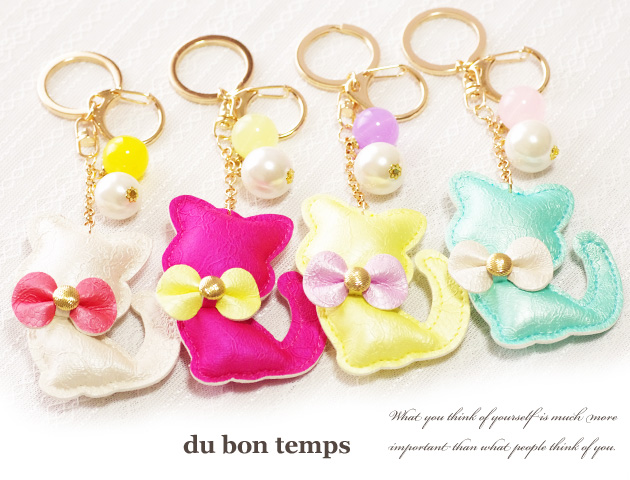 しっぽをクリンと上げた猫のフォルムが可愛い♪バッグチャーム(キーホルダー)です。キレイなパステルカラーで、いつものバッグに着けるだけで華やか&キュートに!大きなパールやカラーボール、首もとに付いたリボンも素敵です。バッグチャームの他にもキーホルダーが付いています。ちょっとした贈り物にも最適です♪全4カラーよりお選びいただけます。