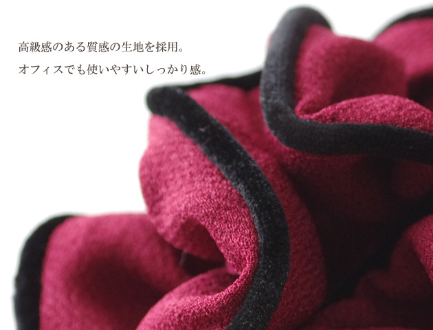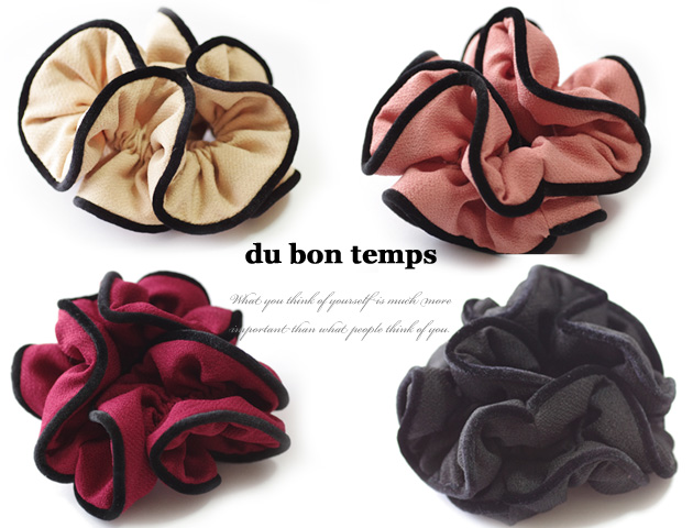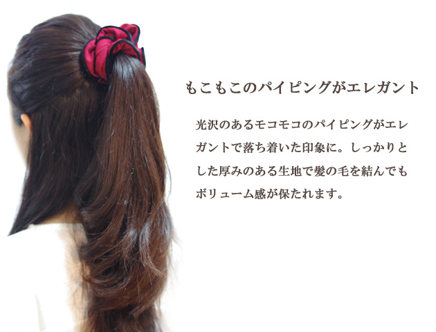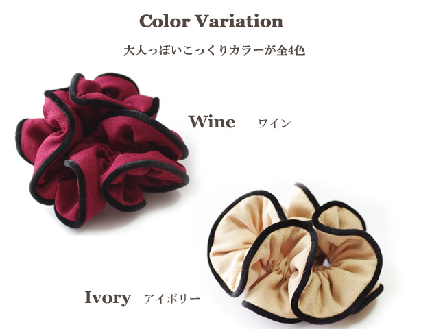 シンプルだから使いやすい♪ボリューミーシュシュ。しっかりした素材のフリルで髪の毛を結んでもちゃんとボリュームが保たれます。ブラックのパイピングが大人っぽく上品に仕上げています。いくつあっても困らないシュシュはちょっとした贈り物にも喜ばれます。全4カラーよりお選びいただけます。
