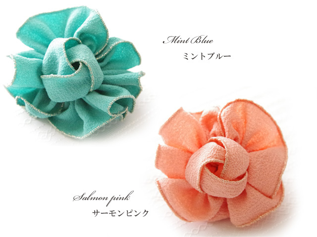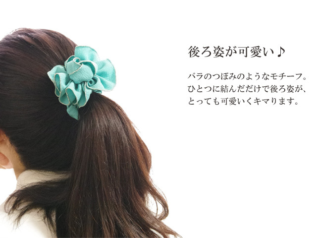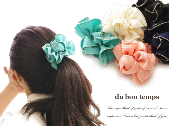 フリルフラワーがついたシュシュ。フリルの中心にはバラのつぼみのようなモチーフが♪細身のシュシュは髪をまとめやすく、フリルフラワーをトップに持ってくるのが容易です。ぱっと結ぶだけでふんわりと可愛らしさをプラスしてくれるシュシュです。全5カラーよりお選びいただけます。