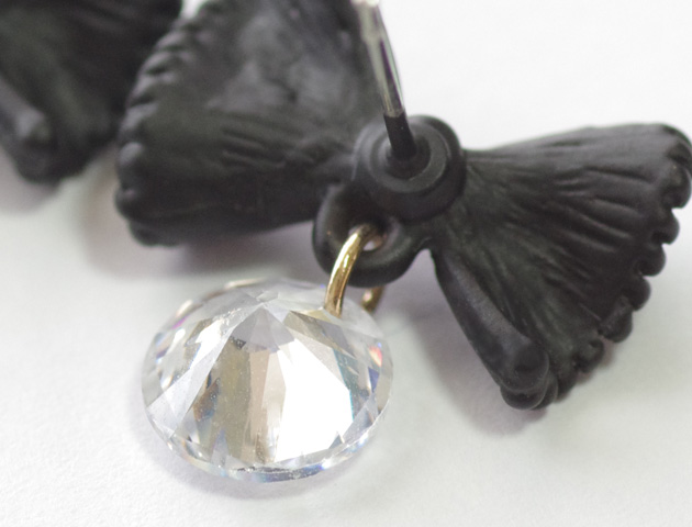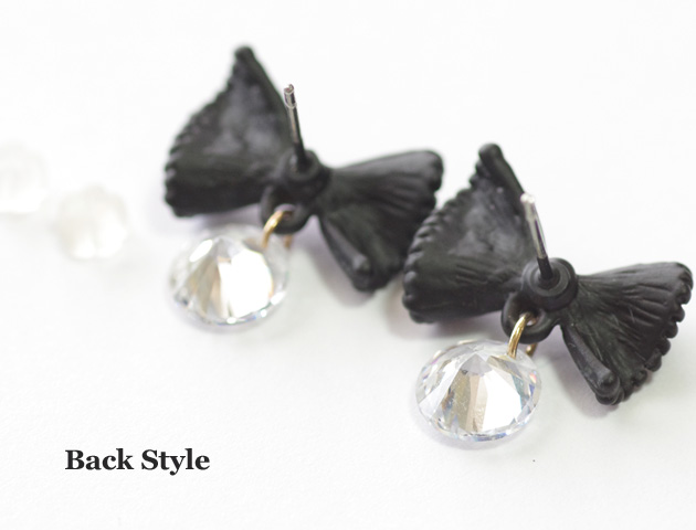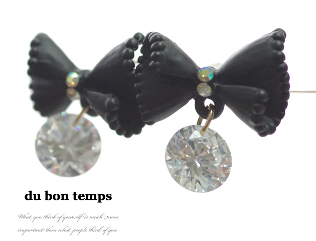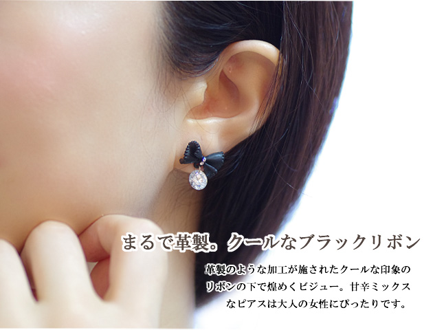 リボンとビジューがダブルで揺れながら煌めく可愛らしいピアス。リボンはわざとシワを演出し革製の様に加工されています。リボンモチーフでも子供っぽくないので、大人の女性におすすめ。カジュアルなスタイルからちょっと落ち着いたスタイルまで幅広く普段使いしていただけるピアスです。