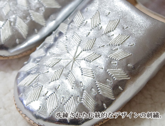 モロッコの伝統的な刺繍が素敵なバブーシュのシルバーです。洗練された飽きのこないデザインの刺繍は白色でシルバーとの相性も抜群です。光沢のあるシルバーは履いているだけで気分が上がります♪とても柔らかい羊革でできており、履き込むごとに足の形になじみ、冬は暖かく、夏は涼しく、その履き心地は格別。一度履くとリピートされる方が多いアイテムです。化学薬品や漂白剤を一切使用しない伝統的な手法でなめされた革を使用しています。モロッコのバブーシュ職人によりひとつひとつ丁寧に仕上げられた逸品ですので贈り物にも最適です。