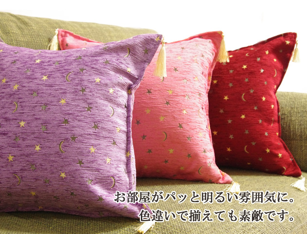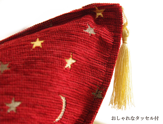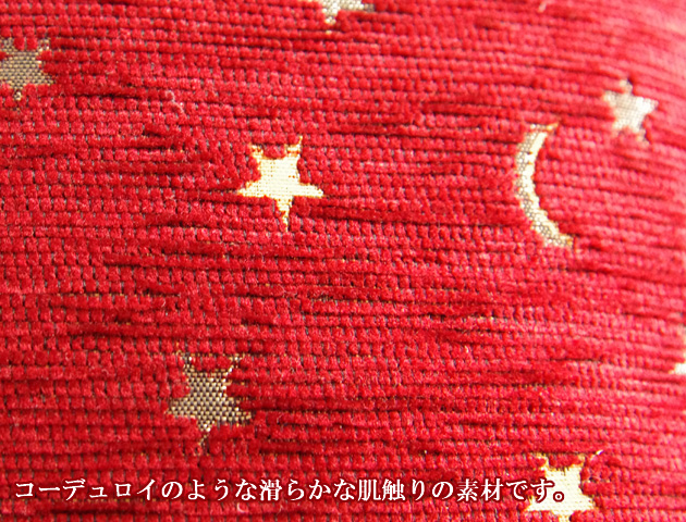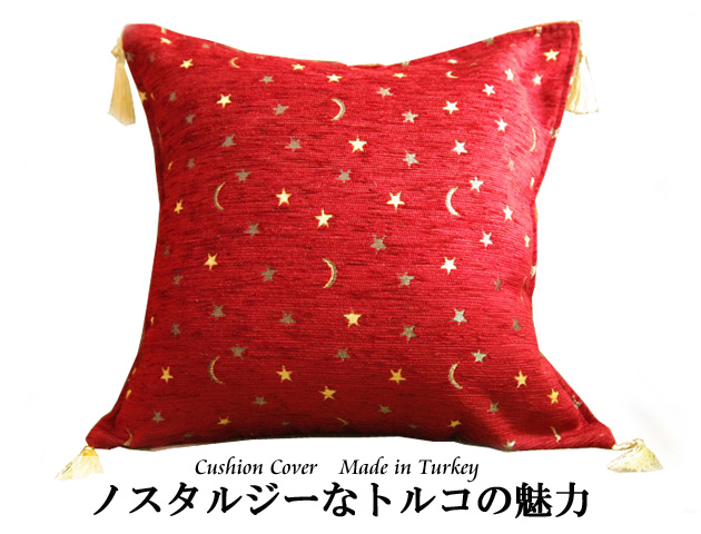 トルコの国旗柄でもある月と星がゴールドの糸で織られたタッセル付クッションカバーです。しっかりとした厚手の生地は少し光沢感のあるコーデュロイのように触り心地の良い高級シェニール素材を使用。こっくりとした赤が大人っぽくてゴージャスな印象のボールドはゴールドのタッセルと星と月の柄との相性も抜群!サイズは42×42cmですが、45角のヌードクッションもご利用いただけます。(写真でも45×45角ヌードクッションを使用しています)メール便でのお届けも可能です。高級感のあるクッションカバーは贈り物にもおすすめです。
