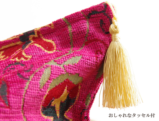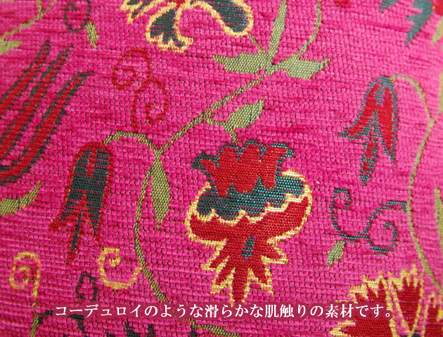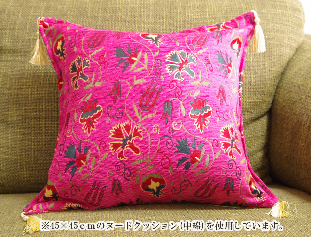 トルコの伝統的な柄でもあるざくろ、チューリップ、カーネーションが織られたタッセル付クッションカバーです。しっかりとした厚手の生地で少し光沢感のあるコーデュロイのように触り心地の良い生地で高級シェニール素材を使用。トルコの人気柄で縁起が良いとされるざくろや、チューリップ、カーネーションがカラフルに描かれたデザイン。ラズベリーピンクはビビットピンクのように濃厚なピンク色でお部屋がパッと明るい雰囲気に。サイズは42×42cmですが、45角のヌードクッションもご利用いただけます。(写真でも45×45角ヌードクッションを使用しています)メール便でのお届けも可能です。高級感のあるクッションカバーは贈り物にもおすすめです。