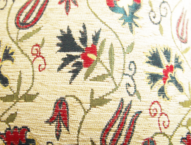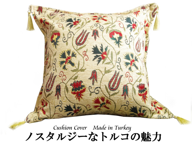 トルコの伝統的な柄でもあるざくろ、チューリップ、カーネーションが織られたタッセル付クッションカバーです。しっかりとした厚手の生地で少し光沢感のあるコーデュロイのように触り心地の良い生地で高級シェニール素材を使用。トルコの人気柄で縁起が良いとされるざくろや、チューリップ、カーネーションがカラフルに描かれたデザイン。ホワイトは大人っぽく、トルコらいいノスタルジックな雰囲気が素敵です。サイズは42×42cmですが、45角のヌードクッションもご利用いただけます。(写真でも45×45角ヌードクッションを使用しています)メール便でのお届けも可能です。高級感のあるクッションカバーは贈り物にもおすすめです。