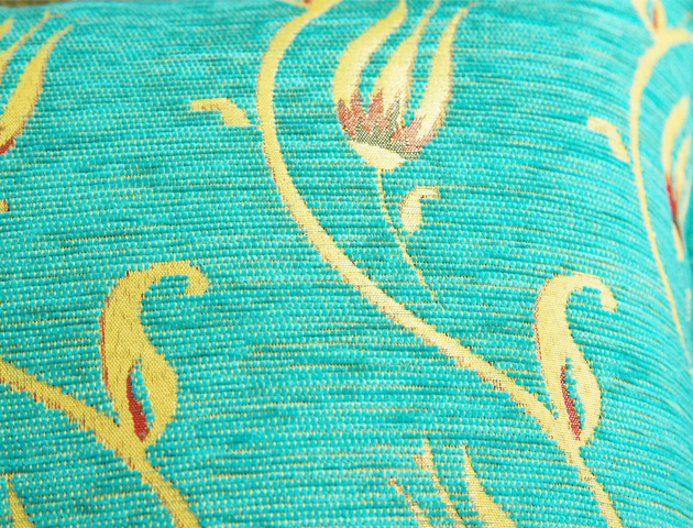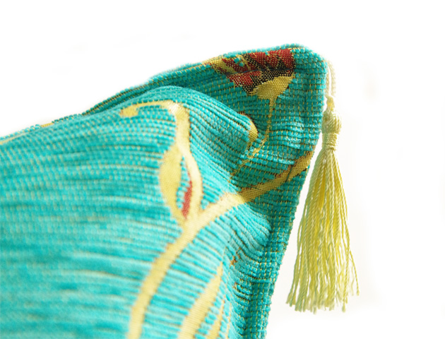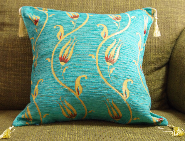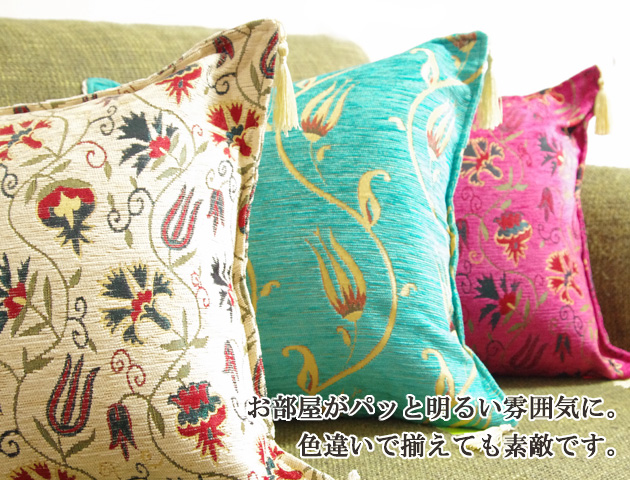トルコの伝統的な柄でもあるチューリップが大胆にデザインされたクッションカバーです。一瞬で目を引く鮮やかなターコイズブルーがとても素敵です。チューリップやタッセルのゴールドとの相性も抜群♪しっかりとした厚手の生地で少し光沢感のあるコーデュロイのように触り心地の良い生地で高級シェニール素材を使用。サイズは42×42cmですが、45角のヌードクッションもご利用いただけます。(写真でも45×45角ヌードクッションを使用しています)メール便でのお届けも可能です。高級感のあるクッションカバーは贈り物にもおすすめです。