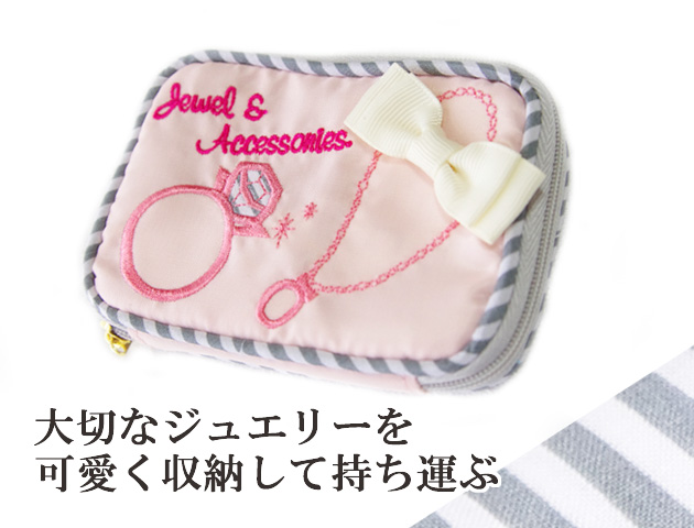 大人気のアクセサリーポーチにNEWカラーライトピンクが仲間入り!落ち着いたカラーに、リングとネックレスのシルエットが刺繍され、右上にはリボンも付いて♪もう可愛さ満点!!縁取りと内側の生地がストライプでお揃いなのも素敵なポイントです。大切なアクセサリー&ジュエリーをしっかり収納できる工夫がたくさん!リングホルダーやピアスホルダーに加え、ファスナー部分はちょっとした小物が収納できるようになっています。よく見るとリングのダイヤ部分にも内側と同じストライプの生地があしらわれています。軽くて汚れにも強いナイロン製。旅行先はもちろん!普段の付け替え用に持ち歩いたり、お家の収納用にも◎。贈り物にもおすすめです。