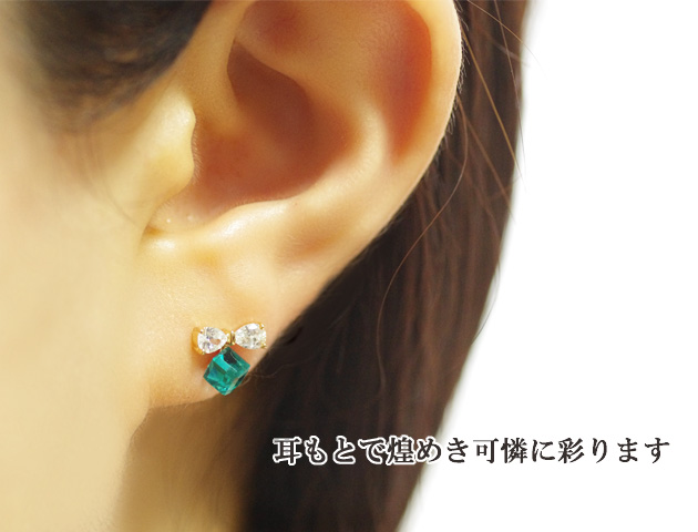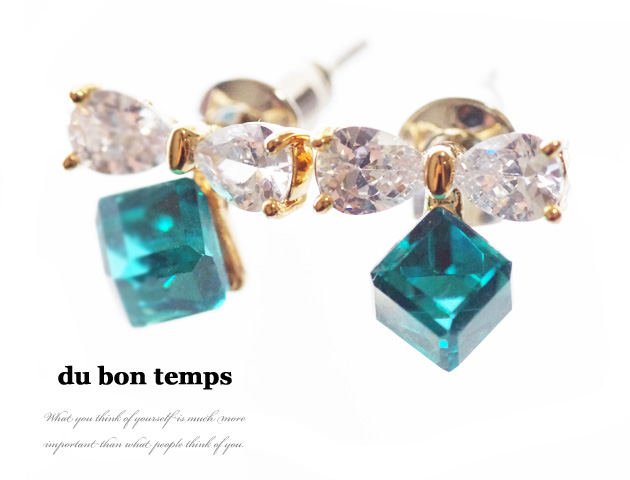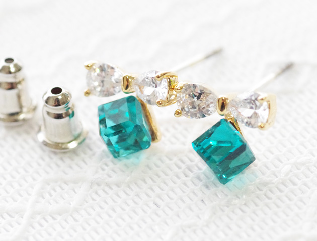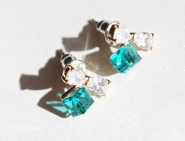 キュービックジルコニアのリボンとグリーンキューブが可憐なピアスです。リボンだけだと可愛くなりすぎそうですが、グリーンキューブと合わせることでスタイリッシュさがプラスされ、大人カワイイ印象に。小さめサイズなので、どんな場面でも使いやすいのも嬉しいポイントです♪