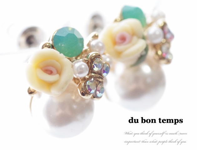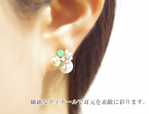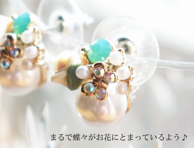ローズモチーフ、パール、蝶々など可愛いを詰め込んだ大人フェミニンなピアスです。蝶々はまるでコサージュにとまっているようにみえます♪繊細なディテールのピアスは女性らしく耳元を華やかに演出してくれます。カジュアルスタイルにはもちろん、華やかなパーティースタイルにも合うので幅広い場面でお使いいただけます。