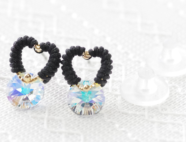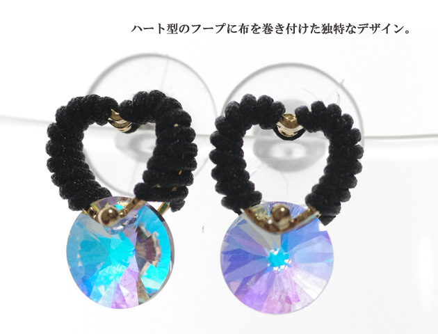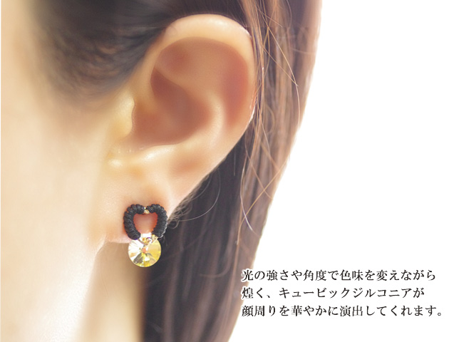 布紐を巻き付けたハート型フープが独特なデザインのピアス。揺れるキュービックジルコニアが光を取り込みキラキラと煌きます。揺れるピアスは女性らしさをさらにアップさせてくれるといわれています。耳元に視線が集中するので小顔効果も。控えめなトーンなので仕事中でもオフタイムでも楽しめます。