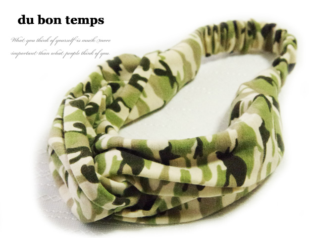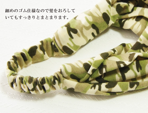 迷彩柄が印象的なヘアバンド(ヘッドバンド)です。クールな印象の迷彩柄は大人カジュアルのスタイルに、遊び心をプラスできちゃうおしゃれアイテム。 ネック後ろは細めのゴム仕様になっているので、髪をおろしておいてもすっきりとまとまります。トップでひねりを効かせたデザインがさりげないアクセントに。さらに幅が広めなので小顔効果も期待できます。外出先でのおしゃれはもちろん!お家の中で前髪を上げたい時などにひとつあると便利です。ヨガやジムなどで髪をまとめたい時に取り入れても素敵です。