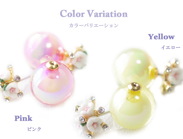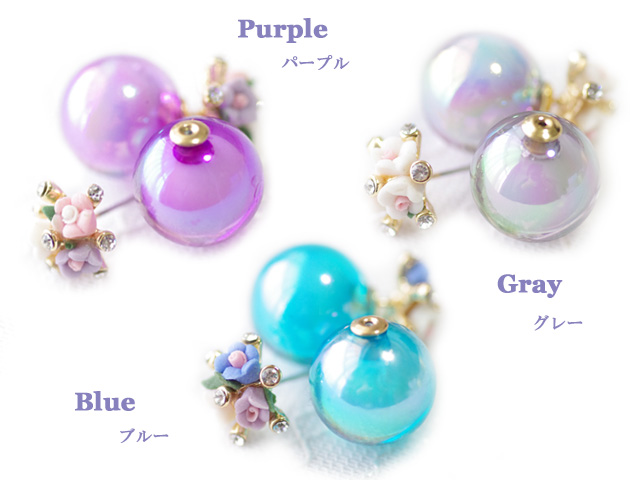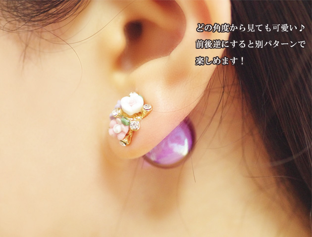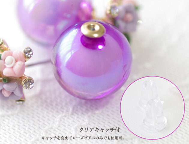 小花とカラフルなキャンディーボールのキャッチが可愛い!バックキャッチピアスです。トップの部分は小花が寄り添いまるでブーケの様に可憐。キャッチ部分は透明感&光沢のあるキャンディーボール。髪をアップにしたり、耳にかけたりした時に見えるバックキャッチはおしゃれの必須アイテムとして定番化しています。クリアキャッチ付きなのでキャンディーボールのキャッチと取り替えればシンプルな小花ピアスとしても使えます!ひとつのピアスで2パターン楽しめるのは嬉しいポイントです。カラーバリエーションも豊富で5色よりお選び頂けます。
