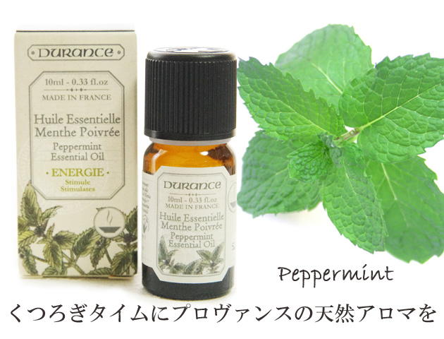 フランス デュランス社のエッセンシャルアロマオイル ペパーミントです。100%ピュアなデュランスエッセンシャルオイル(精油)です。ディフューザーやアロマポットで香りを拡散させたり、ナチュラルマッサージオイルに混ぜ希釈したトリートメントオイルで身体をマッサージしたり、バスタブに数滴垂らしてアロマバスをお楽しみいただけます。 デュランス社はフランス・プロバンス地方のグリニャン城を見下ろす広大な敷地にラベンダー等の畑とオフィス・工場を所有し、製品の製造・販売を行っています。「製品に使用するエッセンス、香料はできる限り自社の畑で有機栽培し、その他の香料も厳選された物のみを使用する」というのがポリシー。デュランス社は大地の恵みを豊かに取り入れた、プロヴァンスの香りを届けるトップブランドの一つです。