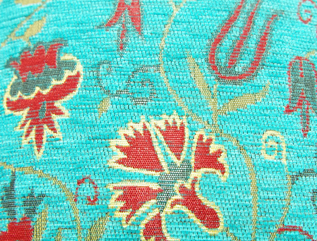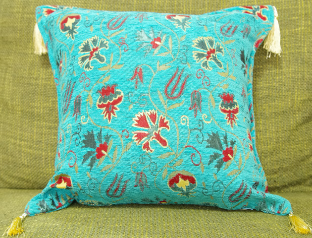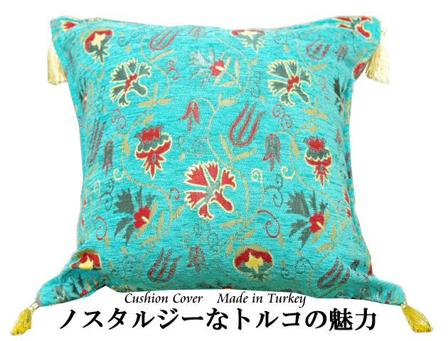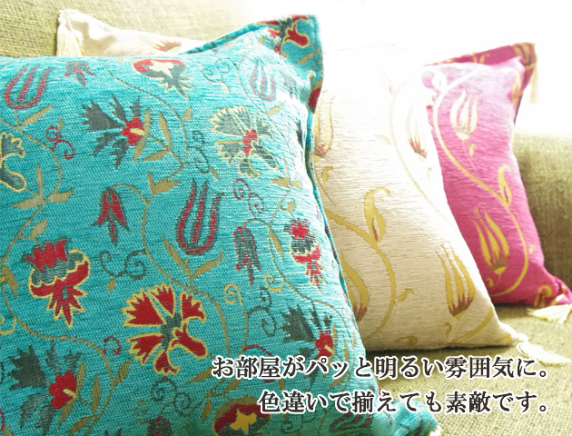 トルコの伝統的な柄でもあるざくろ、チューリップ(トルコ語でラーレ)、カーネーション柄が織られたタッセル付クッションカバーです。しっかりとした厚手の生地は少し光沢感のあるコーデュロイのように触り心地の良い高級シェニール素材を使用。トルコの人気柄で縁起が良いとされるざくろや、チューリップ、カーネーションがカラフルに描かれた大人気のデザイン。サイズは42×42cmですが、45角のヌードクッションもご利用いただけます。(写真でも45×45角ヌードクッションを使用しています)メール便でのお届けも可能です。高級感のあるクッションカバーは贈り物にもおすすめです。